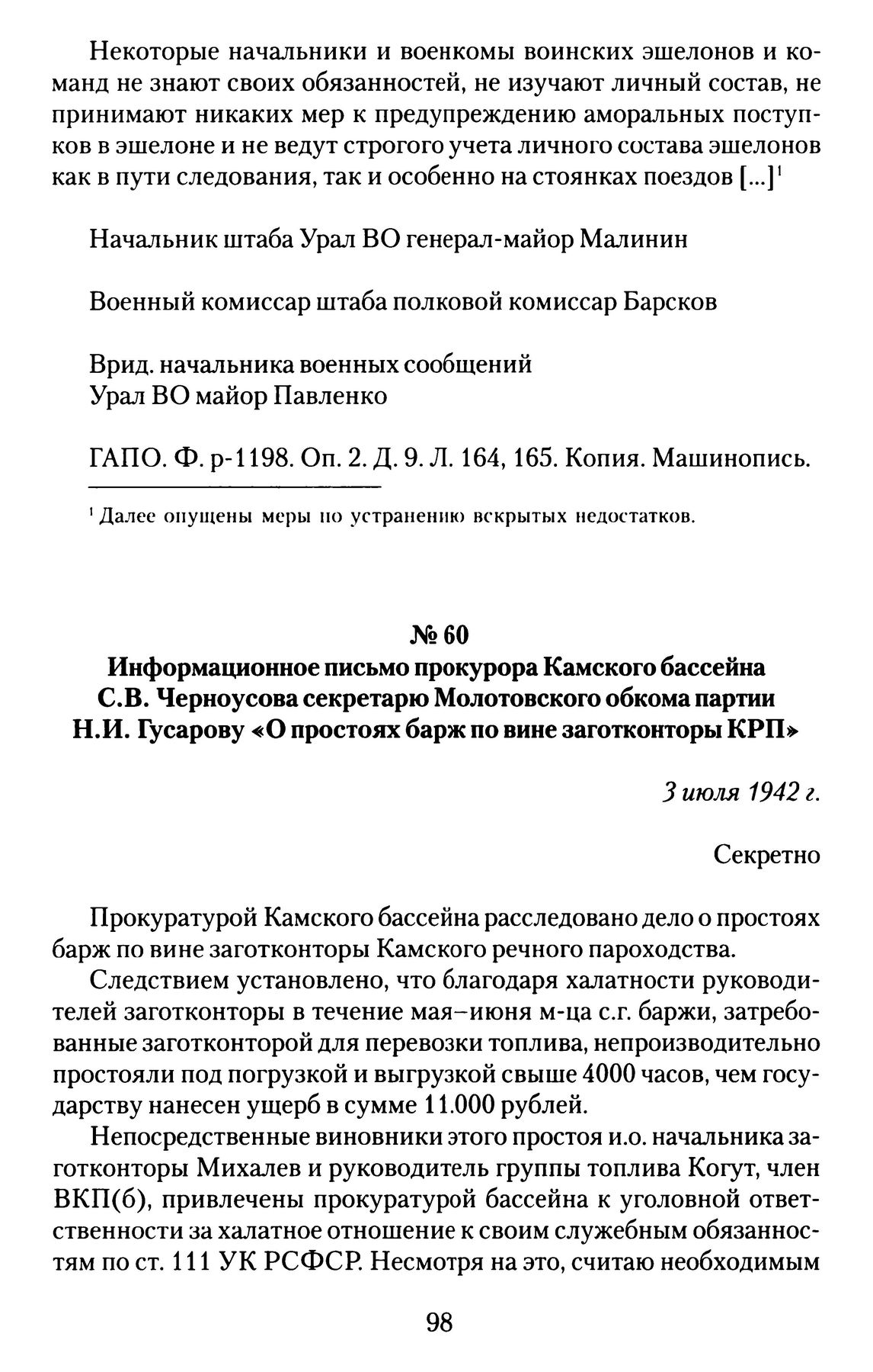 Информационное письмо прокурора Камского бассейна С.В. Черноусова секретарю Молотовского обкома партии Н.И. Гусарову «О простоях барж по вине заготконторы КРП». 3 июля 1942 г. // ГАПО. Ф. р-1195. Оп. 2. Д. 23. Л. 89-90. Подлинник. Машинопись.