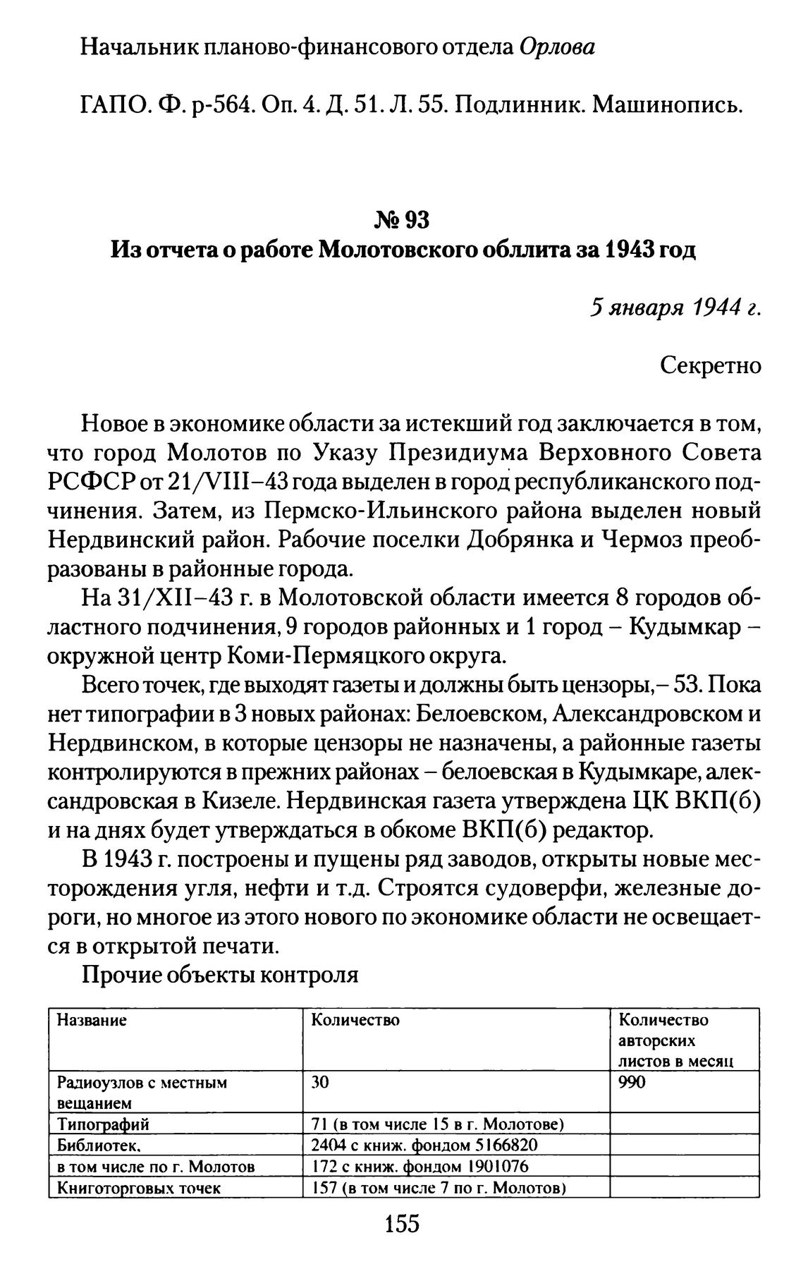 Из отчета о работе Молотовского обллита за 1943 год. 5 января 1944 г.