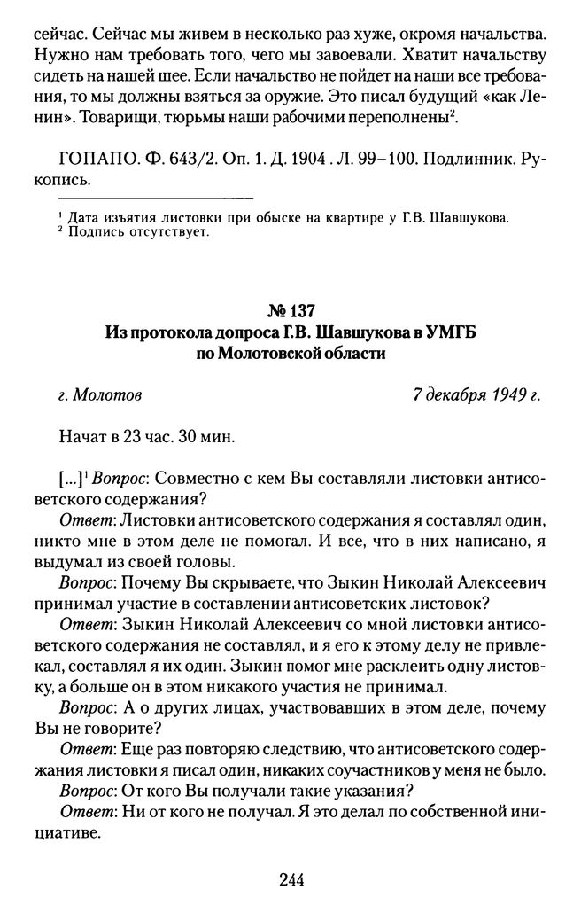 Из протокола допроса Г.В. Шавшукова в УМГБ по Молотовской области. 7 декабря 1949 г. // ГОПАПО. Ф. 643/2. Оп. 1. Д. 1904 . Л. 21о6-22об. Подлинник. Рукопись.