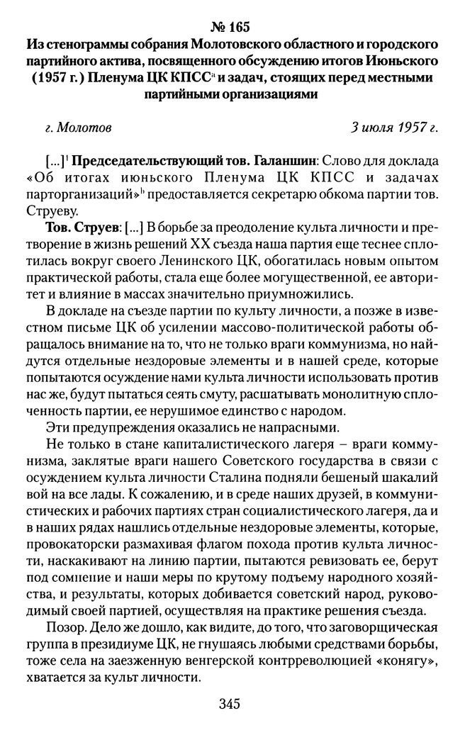 Из стенограммы собрания Молотовского областного и городского партийного актива, посвященного обсуждению итогов Июньского (1957 г.) Пленума ЦК КПСС и задач, стоящих перед местными партийными организациями. 3 июля 1957 г. // ГОПАПО. Ф. 105. Оп. 24. Д. 67. Л. 2, 11-13, 23, 30-32, 42-43, 74-76, 104. Подлинник. Машинопись.
