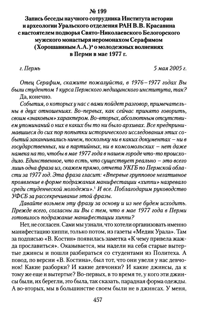 Запись беседы научного сотрудника Института истории и археологии Уральского отделения РАН В.В. Красавина с настоятелем подворья Свято-Николаевского Белогорского мужского монастыря иеромонахом Серафимом (Хорошавиным А.А.) о молодежных волнениях в Перми в мае 1977 г. 5 мая 2005 г. // Архив Пермского филиала Института истории и археологии УрО РАН. Подлинник. Машинопись.