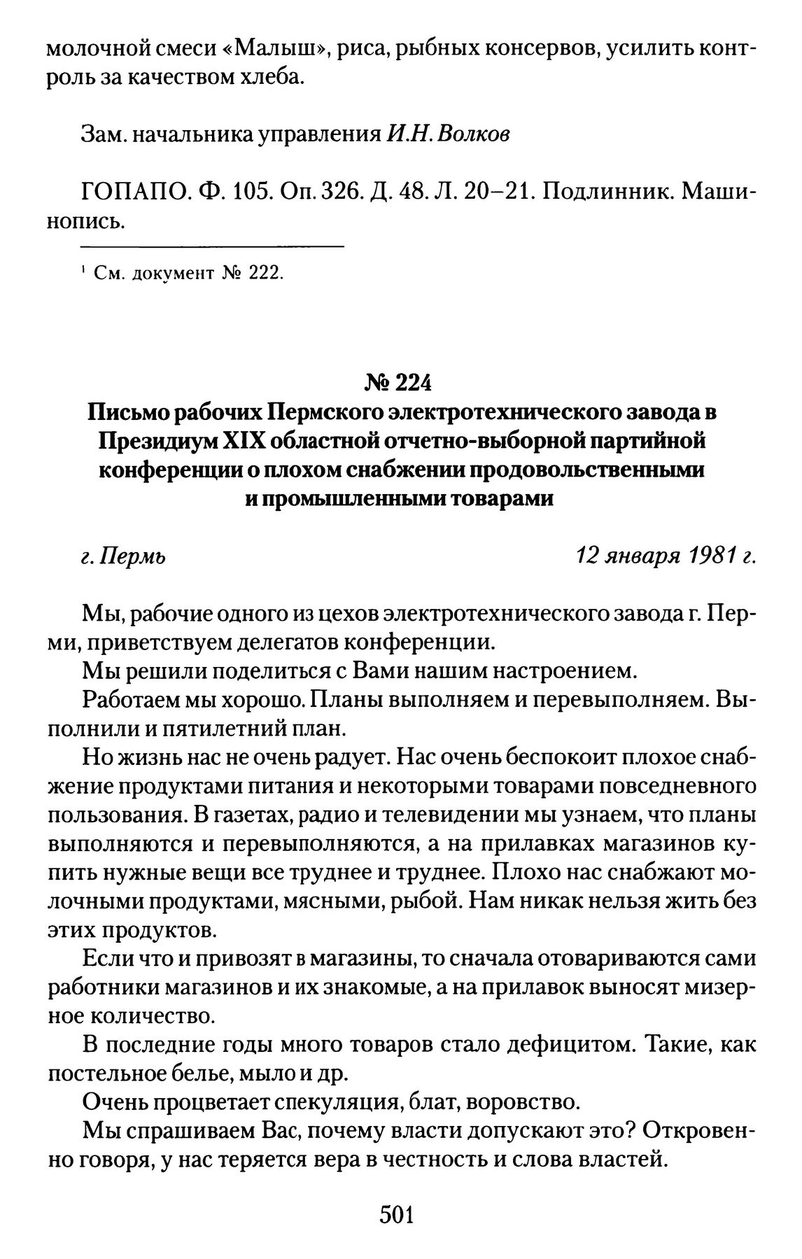Письмо рабочих Пермского электротехнического завода в Президиум XIX областной отчетно-выборной партийной конференции о плохом снабжении продовольственными и промышленными товарами. 12 января 1981 г.