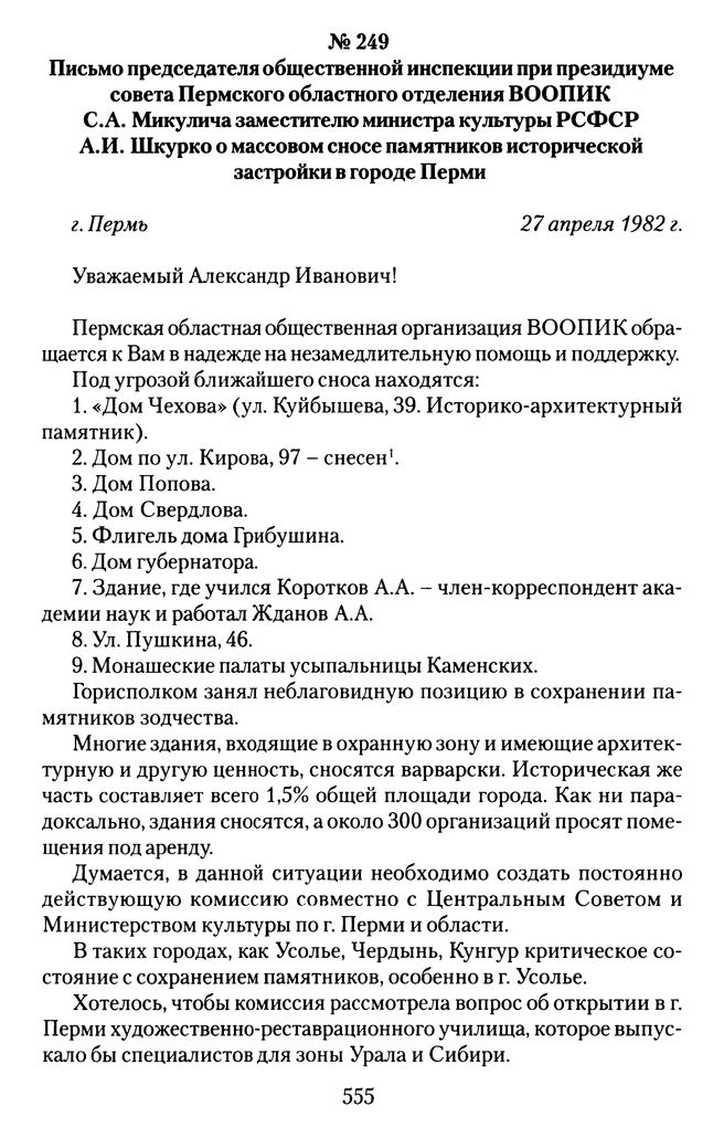 Письмо председателя общественной инспекции при президиуме совета Пермского областного отделения ВООПИК С.А. Микулича заместителю министра культуры РСФСР A. И. Шкурко о массовом сносе памятников исторической застройки в городе Перми. 27 апреля 1982 г. // ГОПАПО. Ф. 3688. Оп. 1. Д. 255. Л. 16. Подлинник. Машинопись.