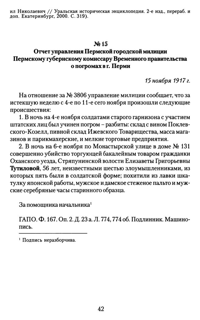 Отчет управления Пермской городской милиции Пермскому губернскому комиссару Временного правительства о погромах в г. Перми. 15 ноября 1917 г. // ГАПО. Ф. 167. Оп. 2. Д. 23 а. Л. 774,774 об. Подлинник. Машинопись.