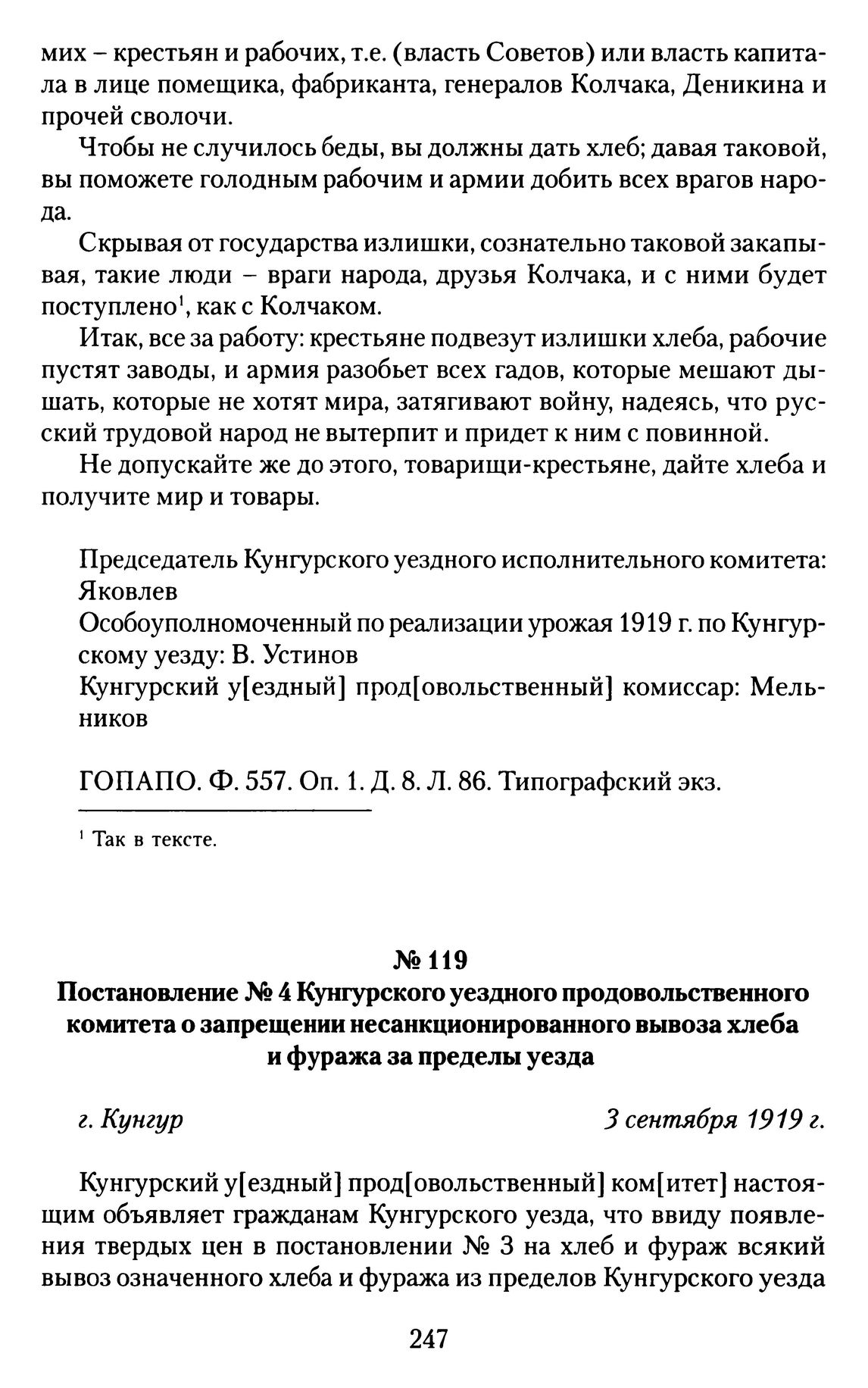 Постановление № 4 Кунгурского уездного продовольственного комитета о запрещении несанкционированного вывоза хлеба и фуража за пределы уезда. г. Кунгур, 3 сентября 1919 г.