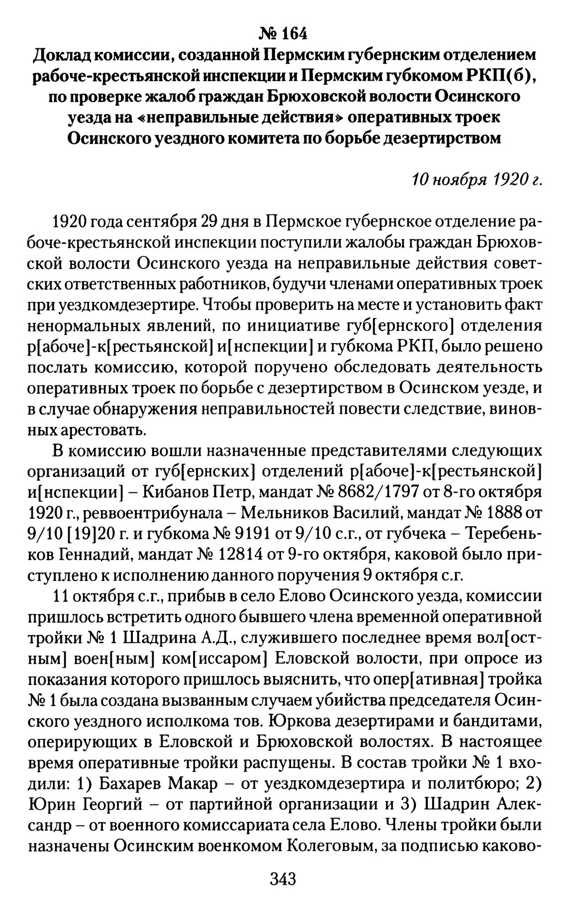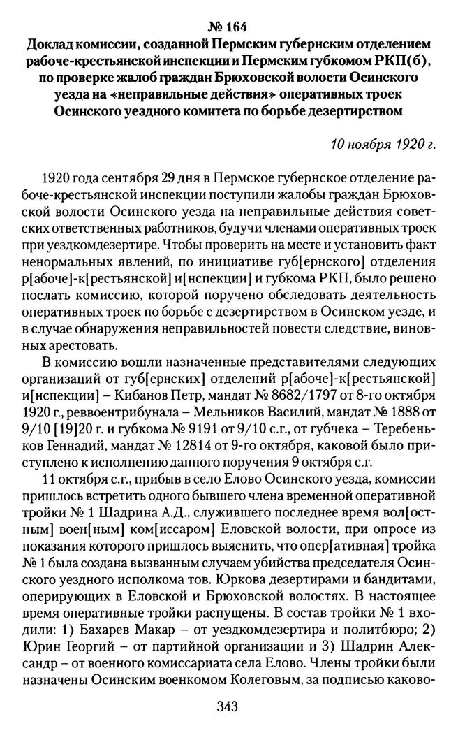 Доклад комиссии, созданной Пермским губернским отделением рабоче-крестьянской инспекции и Пермским губкомом РКП(б), по проверке жалоб граждан Брюховской волости Осинского уезда на «неправильные действия» оперативных троек Осинского уездного комитета по борьбе дезертирством. 10 ноября 1920 г. // ГОПАПО. Ф. 557. Oп. 1. Д. 50. Л. 63-65. Подлинник. Машинопись.