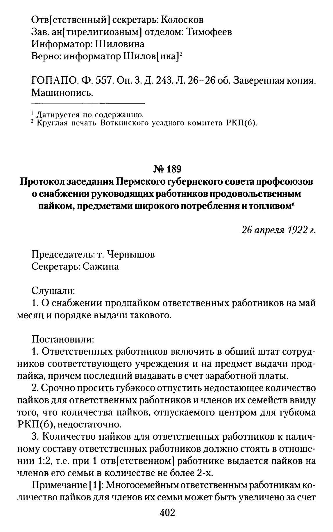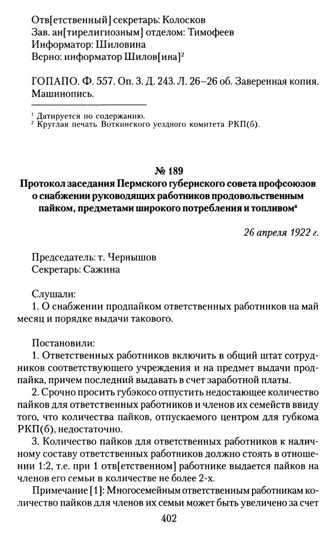 Протокол заседания Пермского губернского совета профсоюзов о снабжении руководящих работников продовольственным пайком, предметами широкого потребления и топливом. 26 апреля 1922 г. // ГОПАПО. Ф. 557. Оп. 3. Д. 312. Л. 17, 17 об. Заверенная копия. Машинопись.