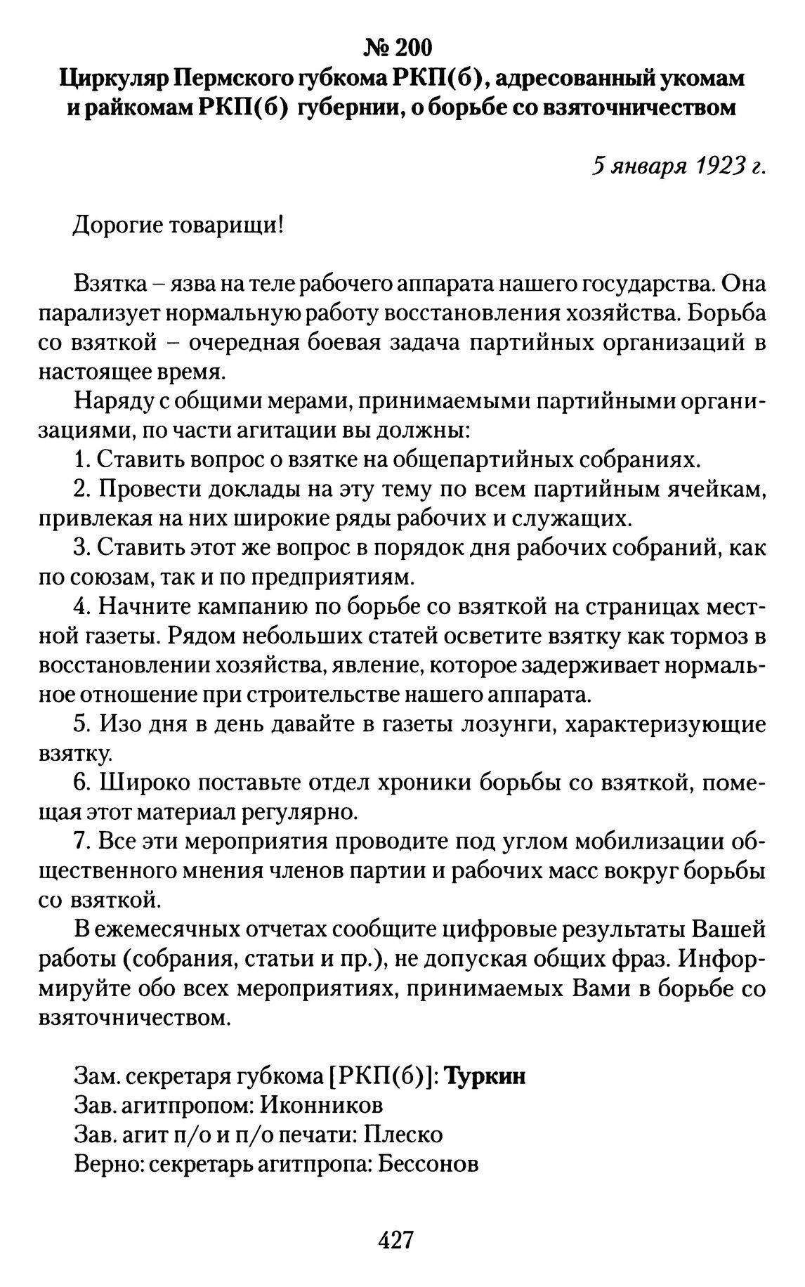 Циркуляр Пермского губкома РКП(б), адресованный укомам и райкомам РКП(б) губернии, о борьбе со взяточничеством. 5 января 1923 г. // ГОПАПО. Ф. 620. Oп. 1. Д. 530. Л. 11. Заверенная копия. Машинопись.