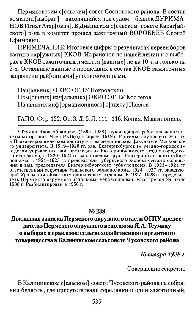 Докладная записка Пермского окружного отдела ОГПУ председателю Пермского окружного исполкома Я.А. Теумину о выборах в правление сельскохозяйственного кредитного товарищества в Калининском сельсовете Чусовского района. 16 января 1928 г. // ГАПО. Ф. р-122. Оп. 3. Д. 5. Л. 129, 130. Подлинник. Машинопись.