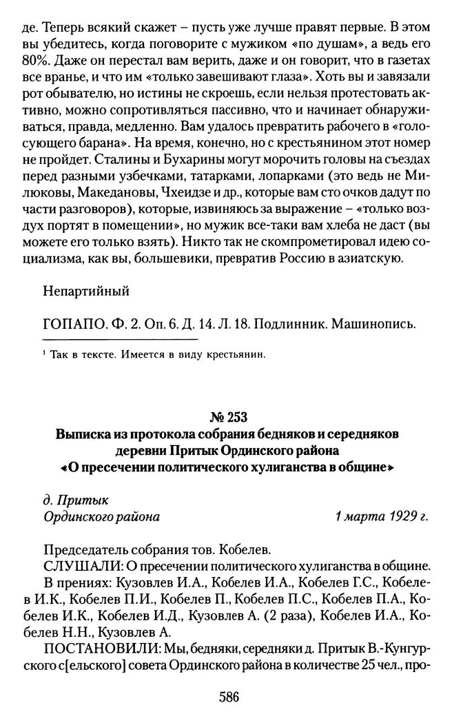 Выписка из протокола собрания бедняков и середняков деревни Притык Ординского района «О пресечении политического хулиганства в общине». д. Притык, Ординского района, 1 марта 1929 г. // ГОПАПО. Ф. 65. Oп. 1. Д. 425. Л. 176. Заверенная копия. Машинопись.