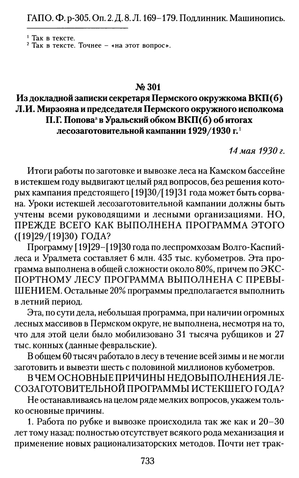 Из докладной записки секретаря Пермского окружкома ВКП(б) Л.И. Мирзояна и председателя Пермского окружного исполкома П.Г. Попова в Уральский обком ВКП(б) об итогах лесозаготовительной кампании 1929/1930 г. 14 мая 1930 г. // ГОПАПО. Ф. 2. Оп. 7. Д. 1. Л. 34-35. Подлинник. Машинопись.