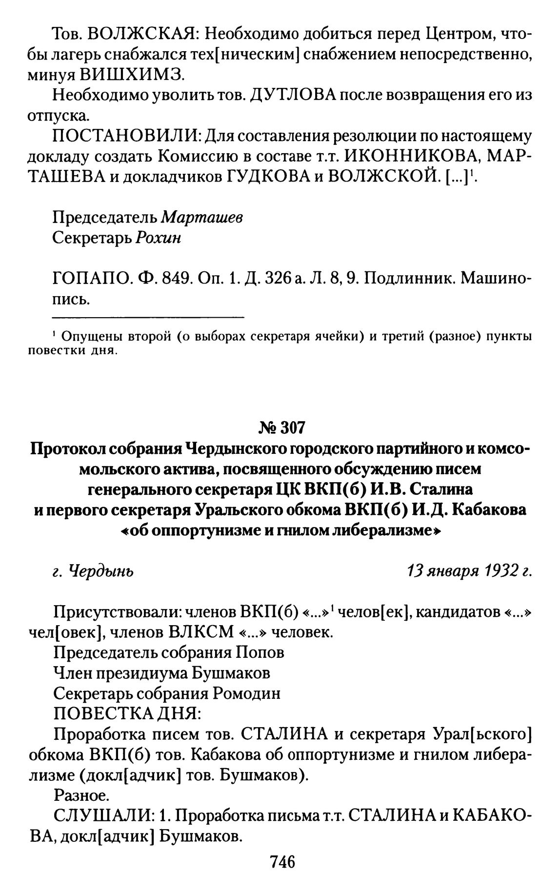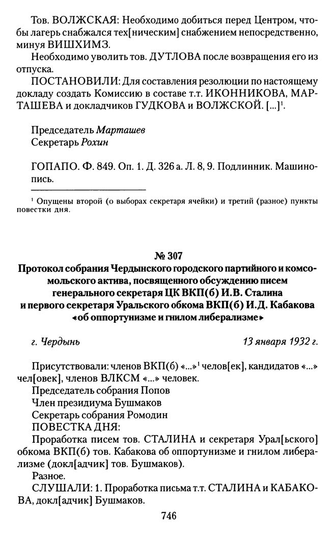 Протокол собрания Чердынского городского партийного и комсомольского актива, посвященного обсуждению писем генерального секретаря ЦК ВКП(б) И.В. Сталина и первого секретаря Уральского обкома ВКП(б) И.Д. Кабакова «об оппортунизме и гнилом либерализме». г. Чердынь, 13 января 1932 г. // ГОПАПО. Ф. 849. Oп. 1. Д. 369. Л. 7-8. Подлинник. Машинопись.