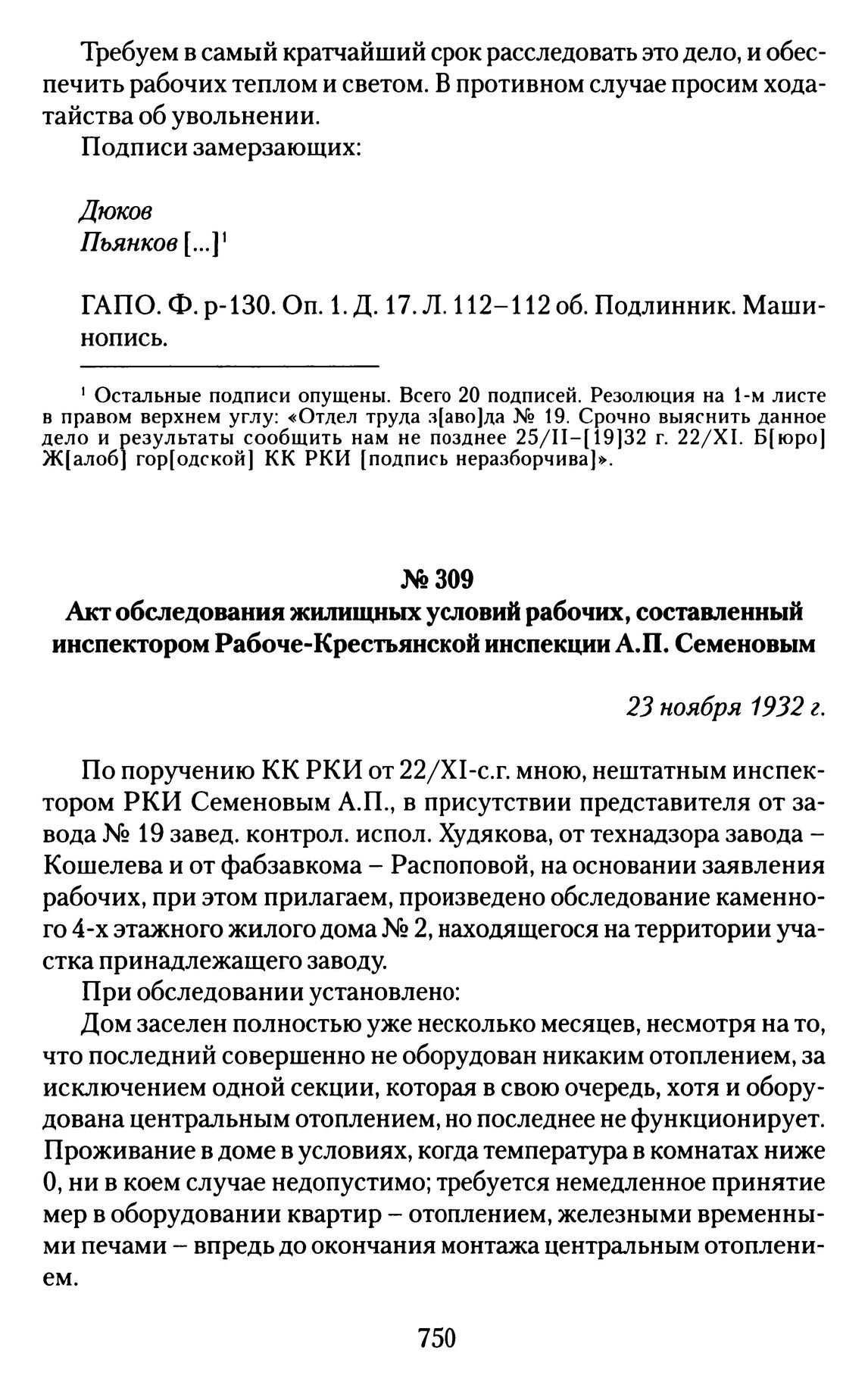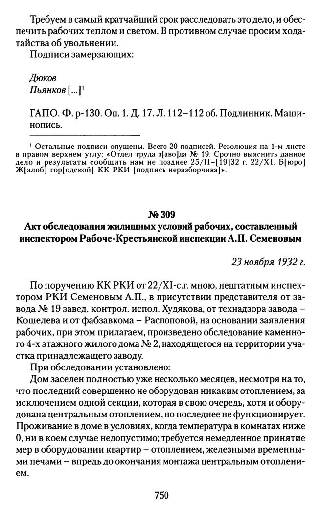 Акт обследования жилищных условий рабочих, составленный инспектором Рабоче-Крестьянской инспекции А.П. Семеновым. 23 ноября 1932 г.