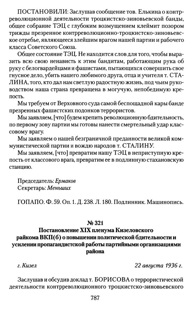 Постановление XIX пленума Кизеловского райкома ВКП(б) о повышении политической бдительности и усилении пропагандистской работы партийными организациями района. г. Кизел, 22 августа 1936 г. // ГОПАПО. Ф. 61. Оп. 16. Д. 2. Л. 37-38. Подлинник. Машинопись.