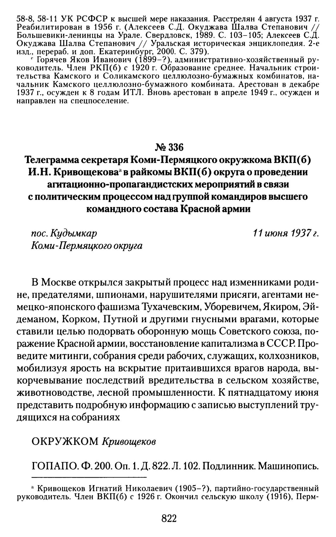 Телеграмма секретаря Коми-Пермяцкого окружкома ВКП(б) И.Н. Кривощекова в райкомы ВКП(б) округа о проведении агитационно-пропагандистских мероприятий в связи с политическим процессом над группой командиров высшего командного состава Красной армии. пос. Кудымкар, Коми-Пермяцкого округа, 11 июня 1937 г. // ГОПАПО. Ф. 200. Оп. 1. Д. 822. Л. 102. Подлинник. Машинопись.