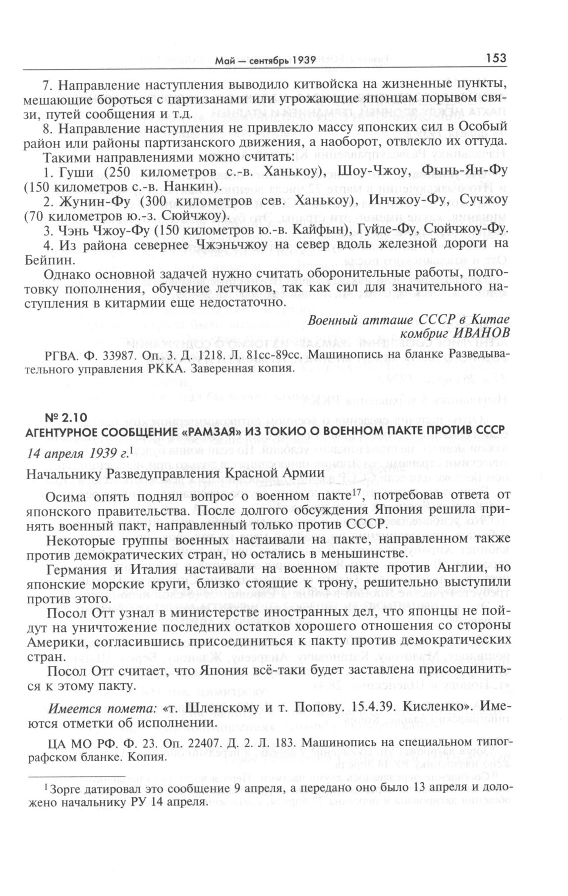 Агентурное сообщение «Рамзая» из Токио о Военном пакте против СССР. 14 апреля 1939 г. // ЦА МО РФ. Ф. 23. Оп. 22407. Д. 2. Л. 183. Машинопись на специальном типографском бланке. Копия.