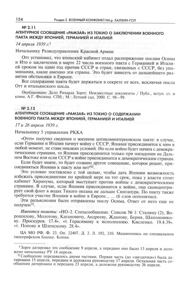 Агентурное сообщение «Рамзая« из Токио о содержании военного пакта между Японией, Германией и Италией. 17 и 26 апреля 1939 г. // ЦА МО РФ. Ф. 23. Оп. 22407. Д. 2. Л. 192, 210. Машинопись на специальном типографском бланке. Копия.