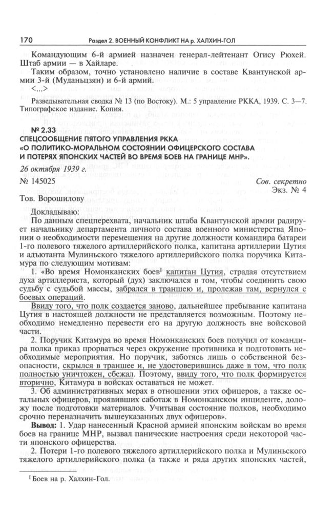 Спецсообщение Пятого Управления РККА «О политико-моральном состоянии офицерского состава и потерях японских частей во время боев на границе МНР». 26 октября 1939 г. // РГВА. Ф. 33987. Оп. 3. Д. 1233. Л. 333сс-334сс. Машинопись на специальном типографском бланке. Копия. Автограф.