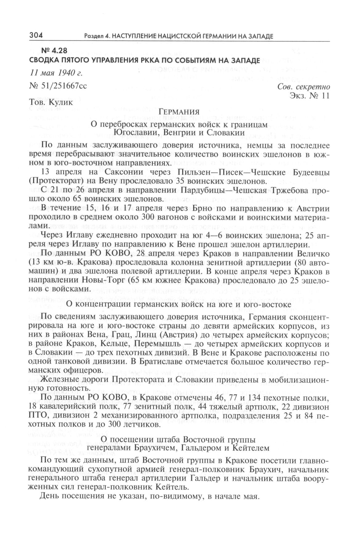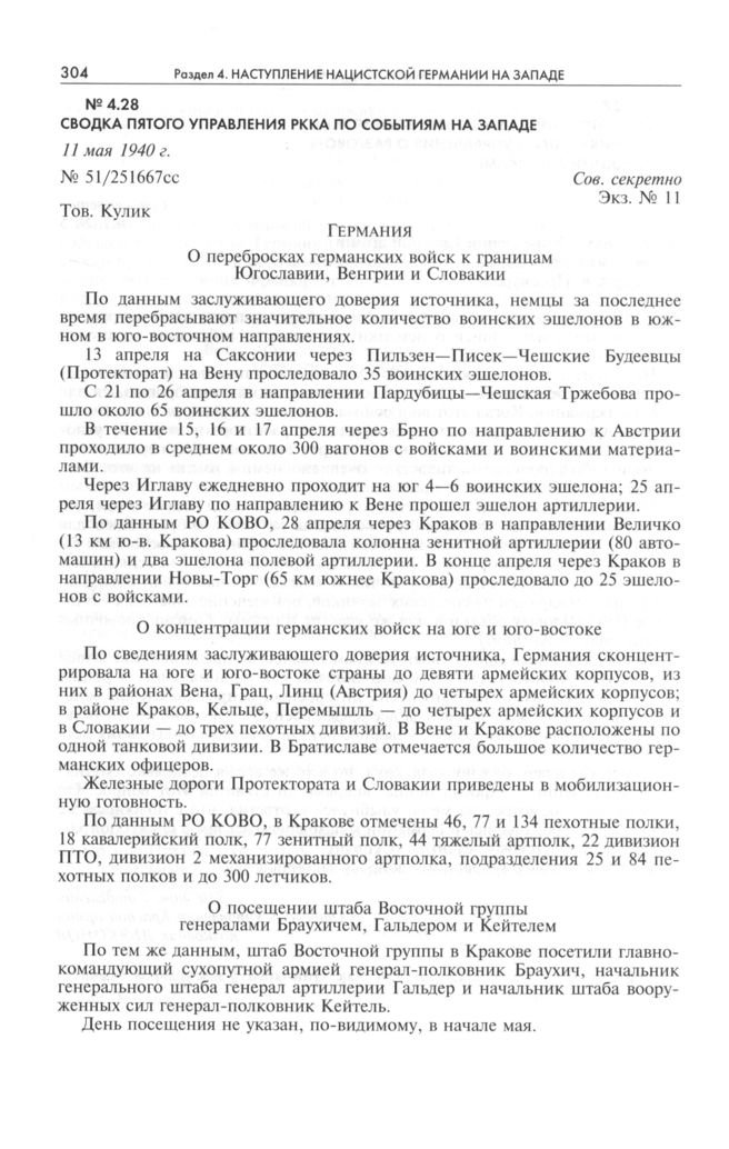 Сводка Пятого Управления РККА по событиям на Западе. 11 мая 1940 г. // РГВА. Ф. 33988. Оп. 4. Д. 35. Л. 310сс-312сс. Машинопись на бланке. Копия.