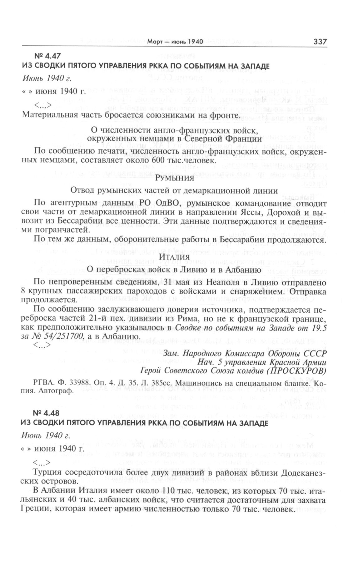 Из сводки Пятого Управления РККА по событиям на Западе [1]. Июнь 1940 г. // РГВА. Ф. 33988. Оп. 4. Д. 35. Л. 385сс. Машинопись на специальном бланке. Копия. Автограф.