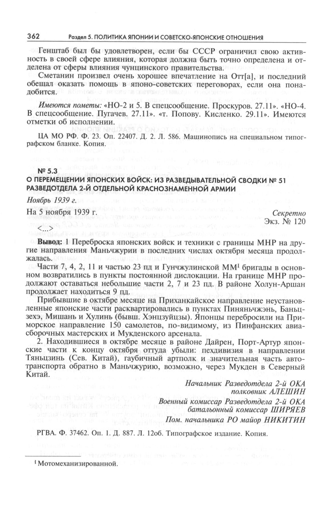 О перемещении японских войск: из разведывательной сводки №51 Разведотдела 2-й отдельной краснознаменной армии. Ноябрь 1939 г. // РГВА. Ф. 37462. Оп. 1. Д. 887. Л. 12об. Типографское издание. Копия.