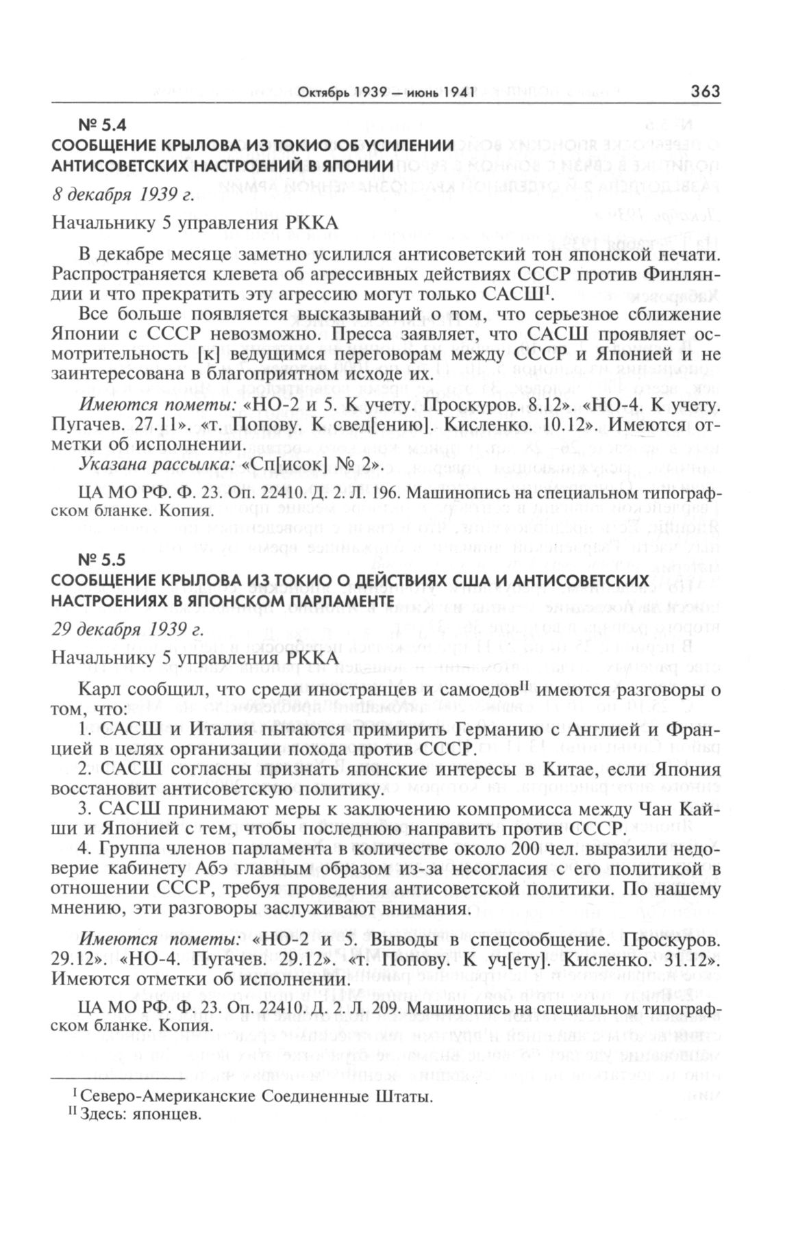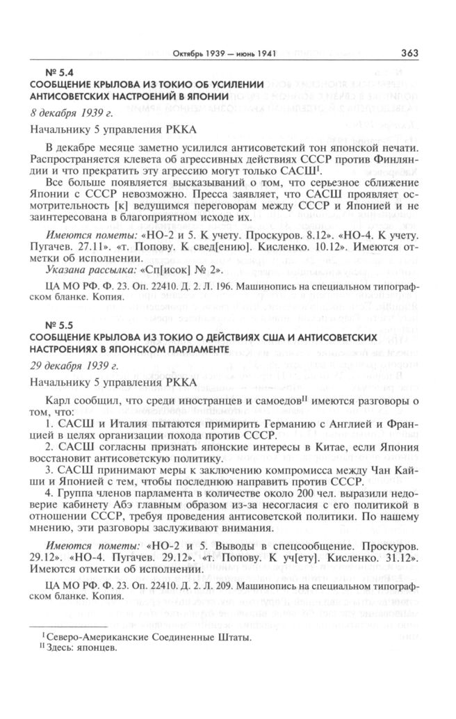 Сообщение Крылова из Токио о действиях США и антисоветских настроениях в японском парламенте. 29 декабря 1939 г. // ЦА МО РФ. Ф. 23. Оп. 22410. Д. 2. Л. 209. Машинопись на специальном типографском бланке. Копия.