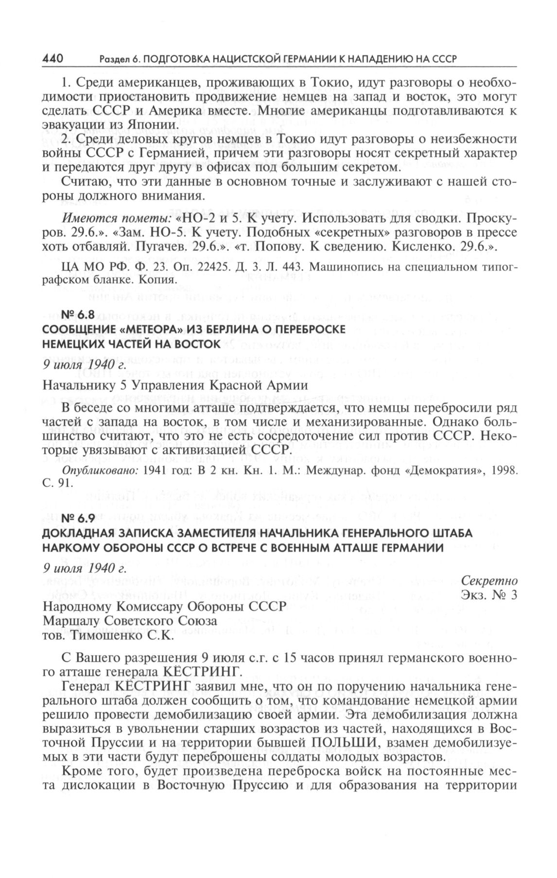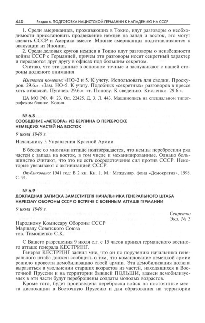 Сообщение «Метеора» из Берлина о переброске немецких частей на Восток. 9 июля 1940 г. // Опубликовано: 1941 год: В 2 кн. Кн. 1. М.: Междунар. фонд «Демократия», 1998. С. 91.