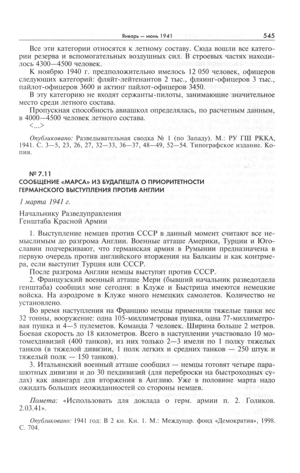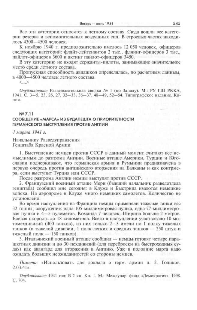 Сообщение «Марса» из Будапешта о приоритетности германского выступления против Англии. 1 марта 1941 г. // Опубликовано: 1941 год: В 2 кн. Кн. 1. М.: Междунар. фонд «Демократия», 1998. С. 704.