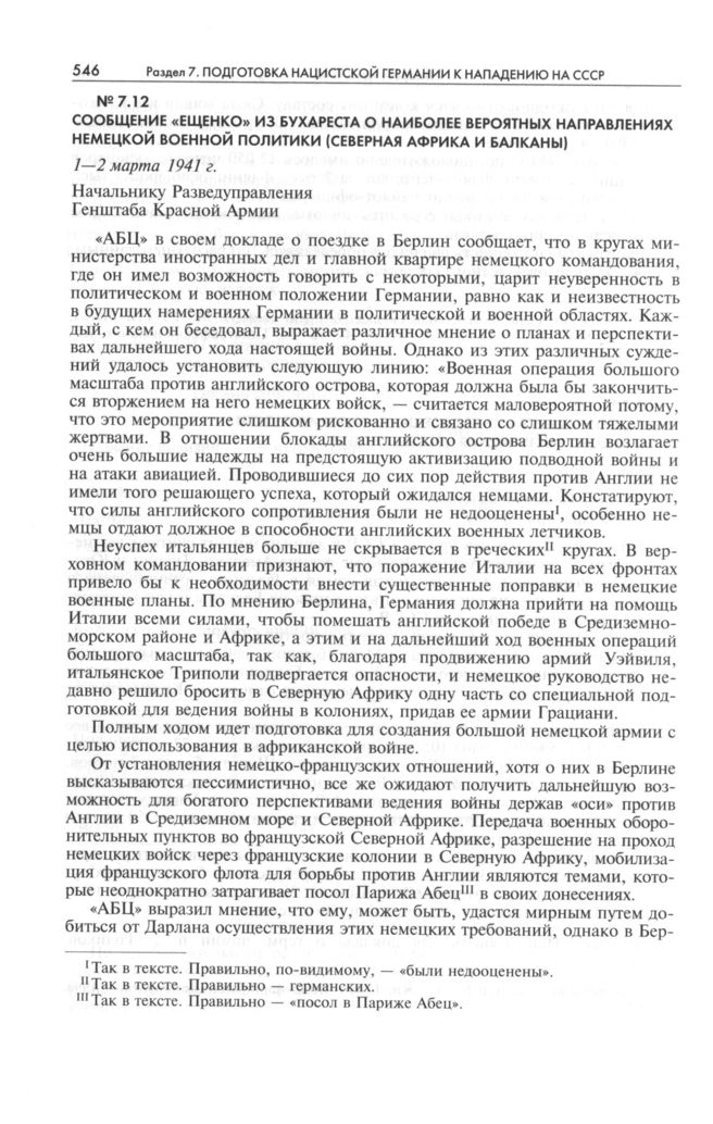 Сообщение «Ещенко» из Бухареста о наиболее вероятных направлениях немецкой военной политики (Северная Африка и Балканы). 1 - 2 марта 1941 г. // Опубликовано: 1941 год: В 2 кн. Кн. 1. М.: Междунар. фонд «Демократия», 1998. С. 706-708.