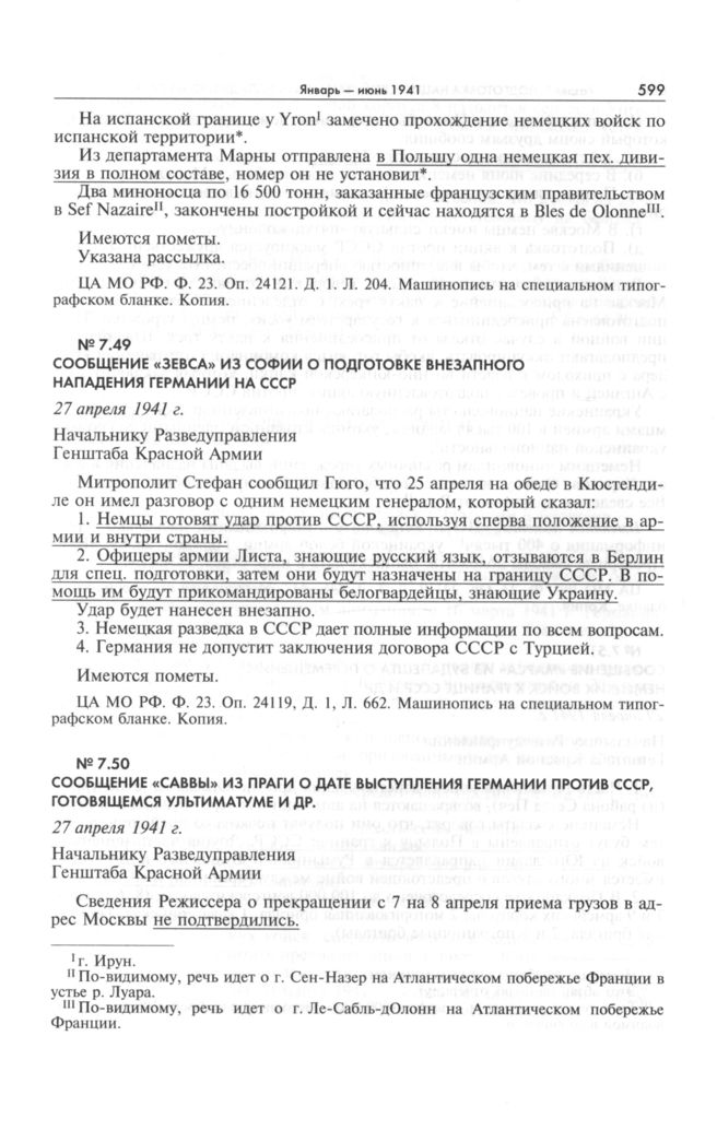 Сообщение «Саввы» из Праги о дате выступления Германии против СССР, готовящемся ультиматуме и др. 27 апреля 1941 г. // ЦА МО РФ. Ф. 23. Оп. 24119. Д. 3. Л. 446—447. Машинопись на специальном бланке. Копия.