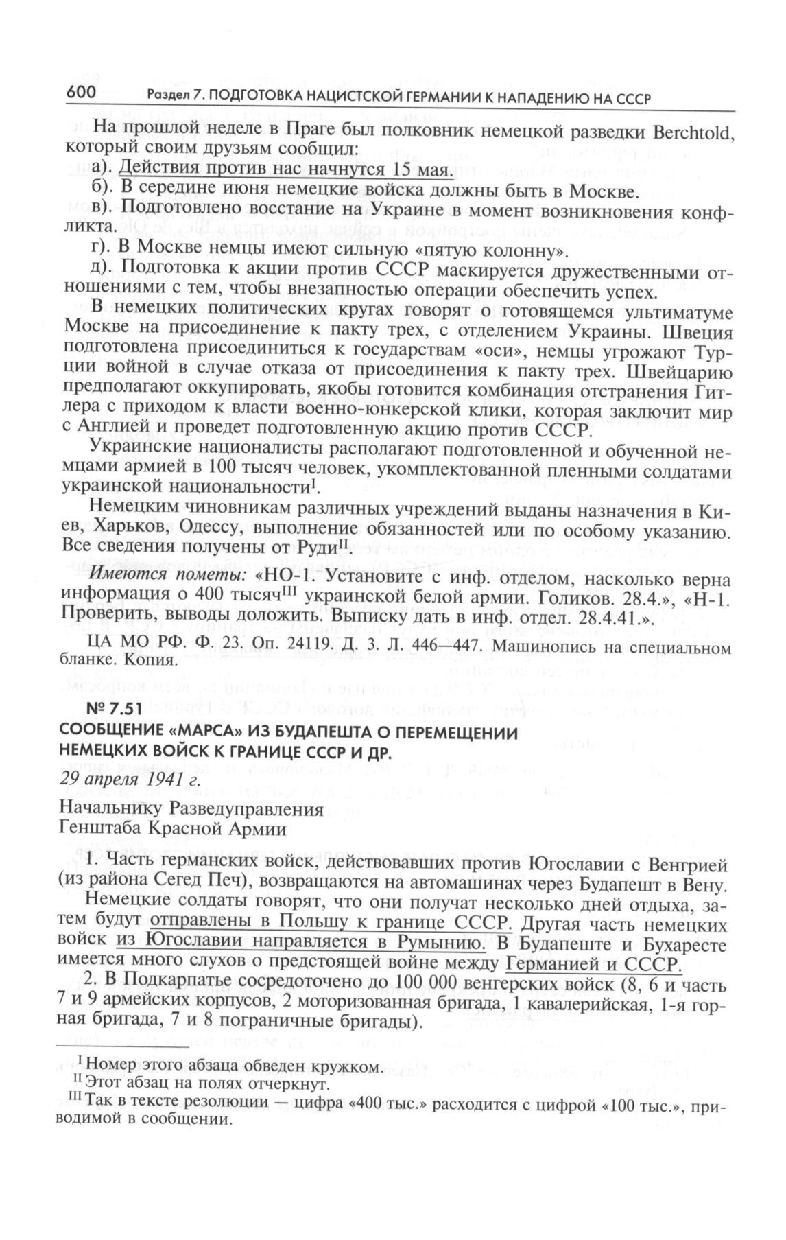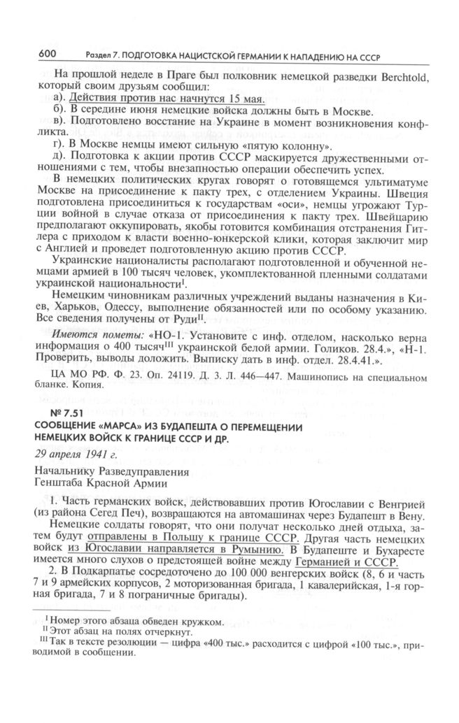 Сообщение «Марса» из Будапешта о перемещении немецких войск к границе СССР и др. 29 апреля 1941 г.