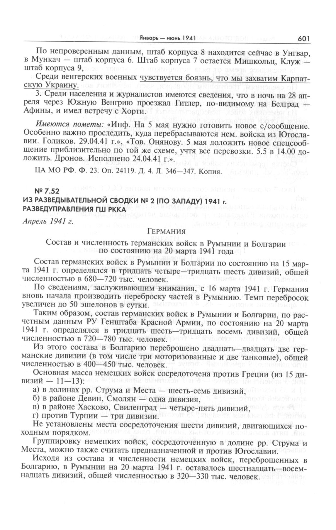 Из разведывательной сводки № 2 (по Западу) 1941 г. Разведуправления ГШ РККА. Апрель 1941 г. // Опубликовано: Разведывательная сводка № 2 (по Западу). М.: РУ ГШ РККА, 1941. С. 3, 6, 26—29, 31—33. Типографское издание. Копия.