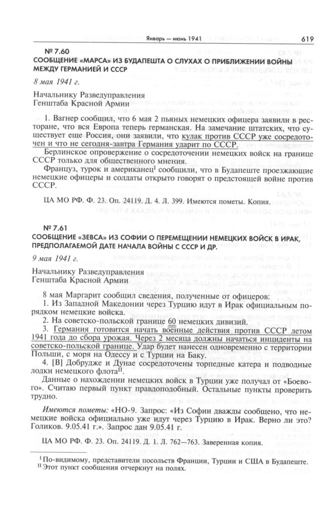 Сообщение «Марса» из Будапешта о слухах о приближении войны между Германией и СССР. 8 мая 1941 г. // ЦА МО РФ. Ф. 23. Оп. 24119. Д. 4. Л. 399. Имеются пометы. Копия.