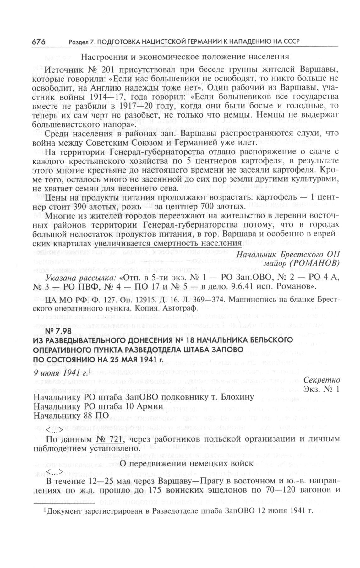 Из разведывательного донесения № 18 начальника Бельского оперативного пункта Разведотдела штаба ЗапОВО по состоянию на 25 мая 1941 г. 9 июня 1941 г. // ЦА МО РФ. Ф. 127. Оп. 12915. Д. 16. Л. 362—368. Машинопись на бланке Бельского оперативного пункта. Копия. Автограф.