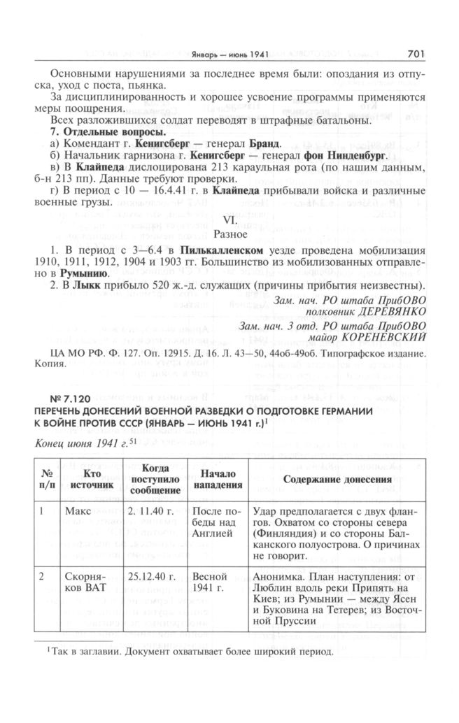 Перечень донесений военной разведки о подготовке Германии к войне против СССР (январь - июнь 1941 г.). Конец июня 1941 г. // Опубликовано: Лота В. Секретный фронт Генерального штаба. Книга о военной разведке. 1940—1942. М.: Молодая гвардия, 2005. С. 220—234.