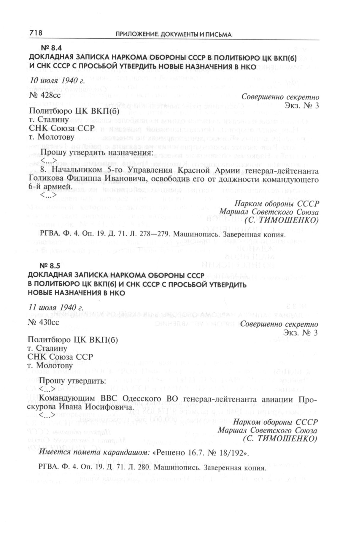 Докладная записка наркома обороны СССР в политбюро ЦК ВКП(б) и СНК СССР с просьбой утвердить новые назначения в НКО. 10 июля 1940 г. // РГВА. Ф. 4. Оп. 19. Д. 71. Л. 278—279. Машинопись. Заверенная копия.
