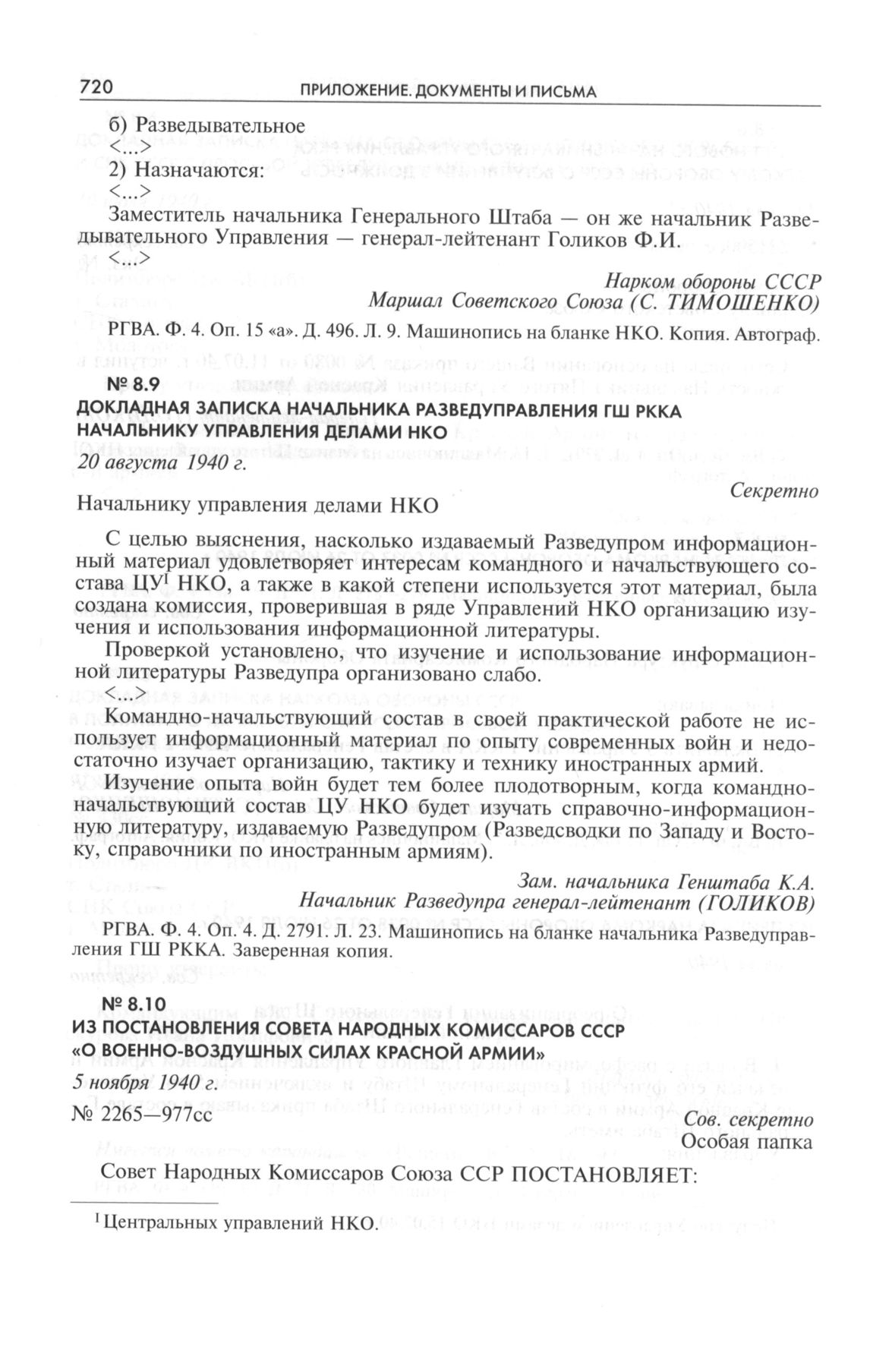 Докладная записка начальника Разведуправления ГШ РККА начальнику управления делами НКО. 20 августа 1940 г. // РГВА. Ф. 4. Оп. 4. Д. 2791. Л. 23. Машинопись на бланке начальника Разведуправления ГШ РККА. Заверенная копия.
