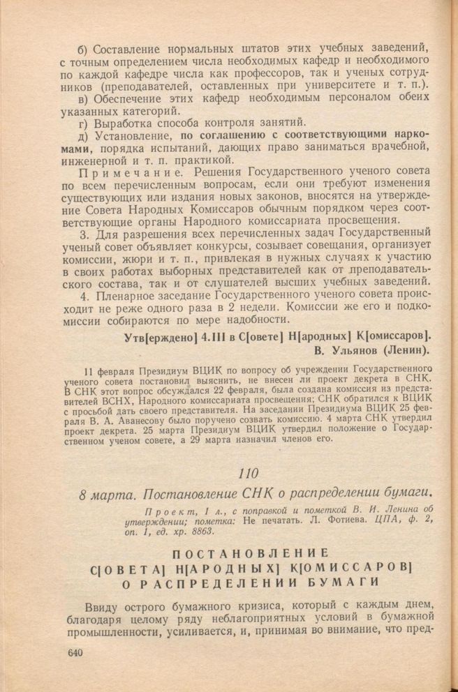 8 марта. Постановление СНК о распределении бумаги // Проект, 1 л., с поправкой и пометкой В. И. Ленина об утверждении; пометка: Не печатать. Л. Фотиева. ЦПА, ф. 2, oп. 1, ед. хр. 8863.