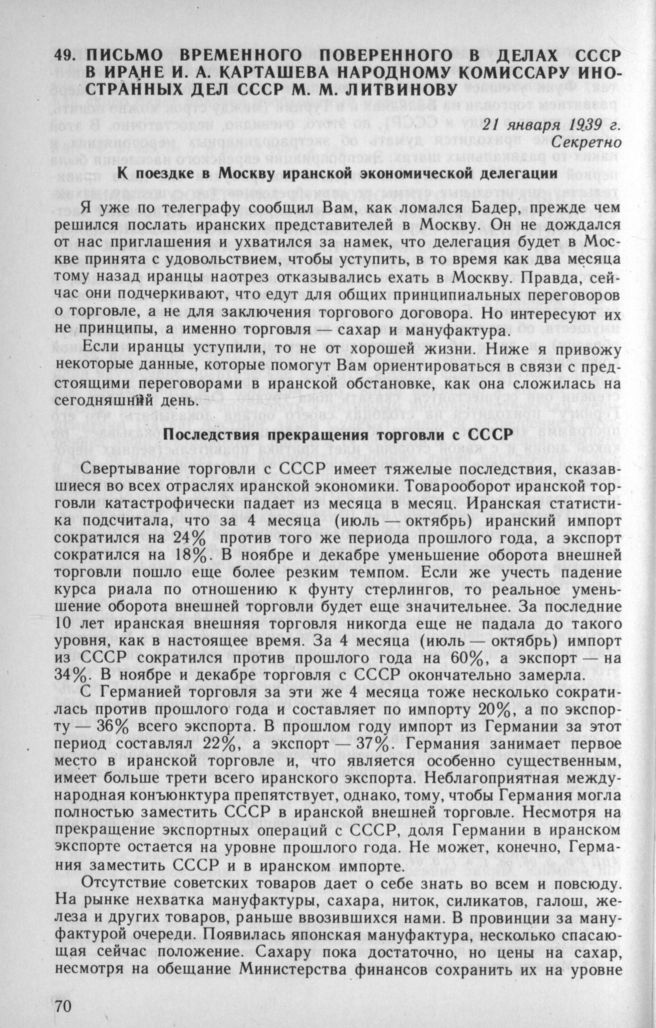Письмо временного поверенного в делах СССР в Иране И. А. Карташева народному комиссару иностранных дел СССР М. М. Литвинову. 21 января 1939 г. // АВП РФ, ф. 011, oп. 4. п. 28, д. 86, л. 22—28.