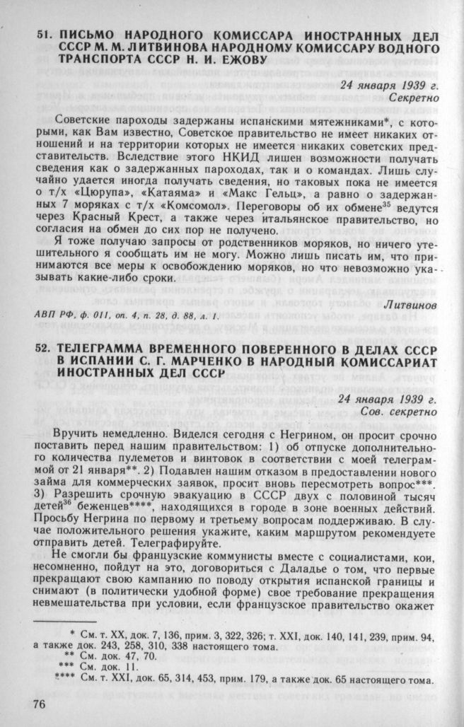 Телеграмма временного поверенного в делах СССР в Испании С. Г. Марченко в Народный комиссариат иностранных дел СССР. 24 января 1939 г. // АВП РФ, ф. 059, oп. 1, п. 294, д. 2032, л. 196.