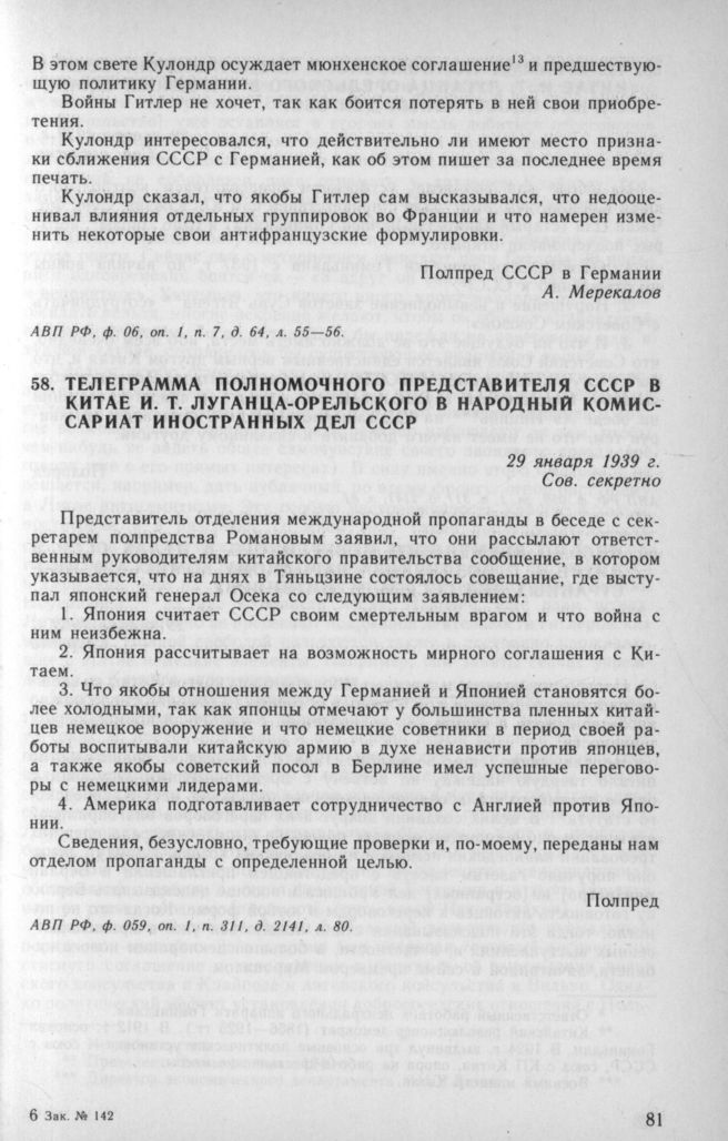 Телеграмма полномочного представителя СССР в Китае И. Т. Луганца-Орельского в Народный комиссариат иностранных дел СССР. 29 января 1939 г. // АВП РФ, ф. 059, oп. 1, п. 311, д. 2141, л. 80.