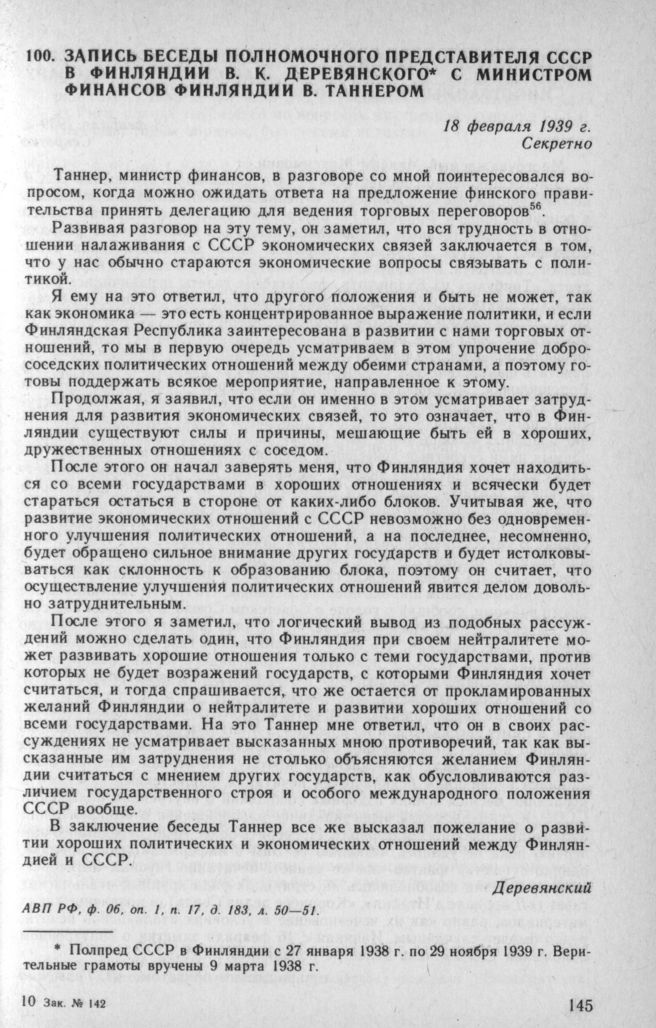 Запись беседы полномочного представителя СССР в Финляндии В. К. Деревянского с министром финансов Финляндии В. Таннером. 18 февраля 1939 г. // АВП РФ, ф. 06, oп. 1, п. 17, д. 183, л. 50—51.
