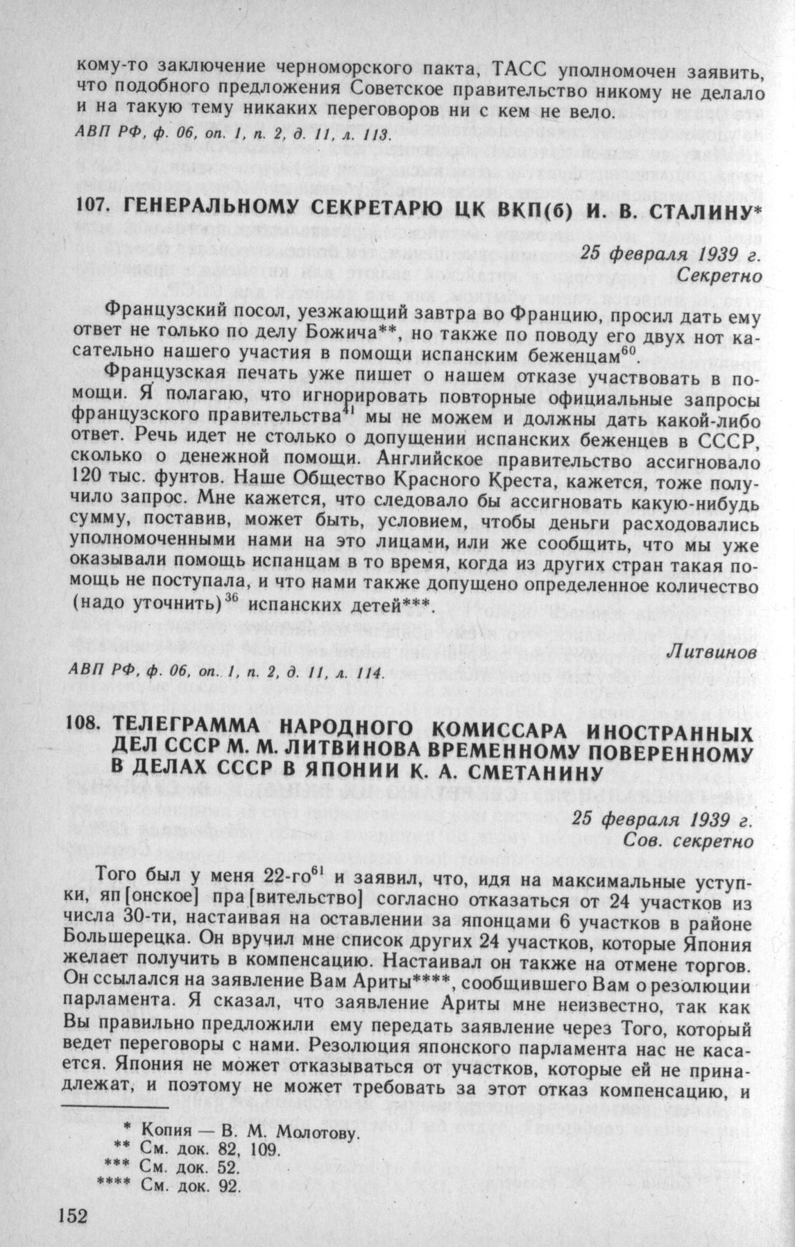 Телеграмма народного комиссара иностранных дел СССР М. М. Литвинова временному поверенному в делах СССР в Японии К. А. Сметанину. 25 февраля 1939 г. // АВП РФ, ф. 059, oп. 1, п. 307, д. 2121, л. 53.