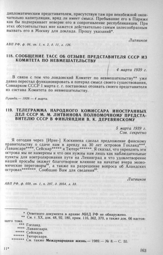 Сообщение ТАСС об отзыве представителя СССР из Комитета по невмешательству. 4 марта 1939 г. // Правда. 1939. 4 марта.