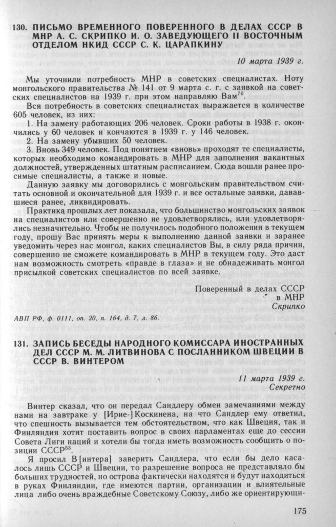 Запись беседы народного комиссара иностранных дел СССР М. М. Литвинова с посланником Швеции в СССР В. Винтером. 11 марта 1939 г. // АВП РФ, ф. 06, oп. 1, п. 18, д. 198. л. 8—9.