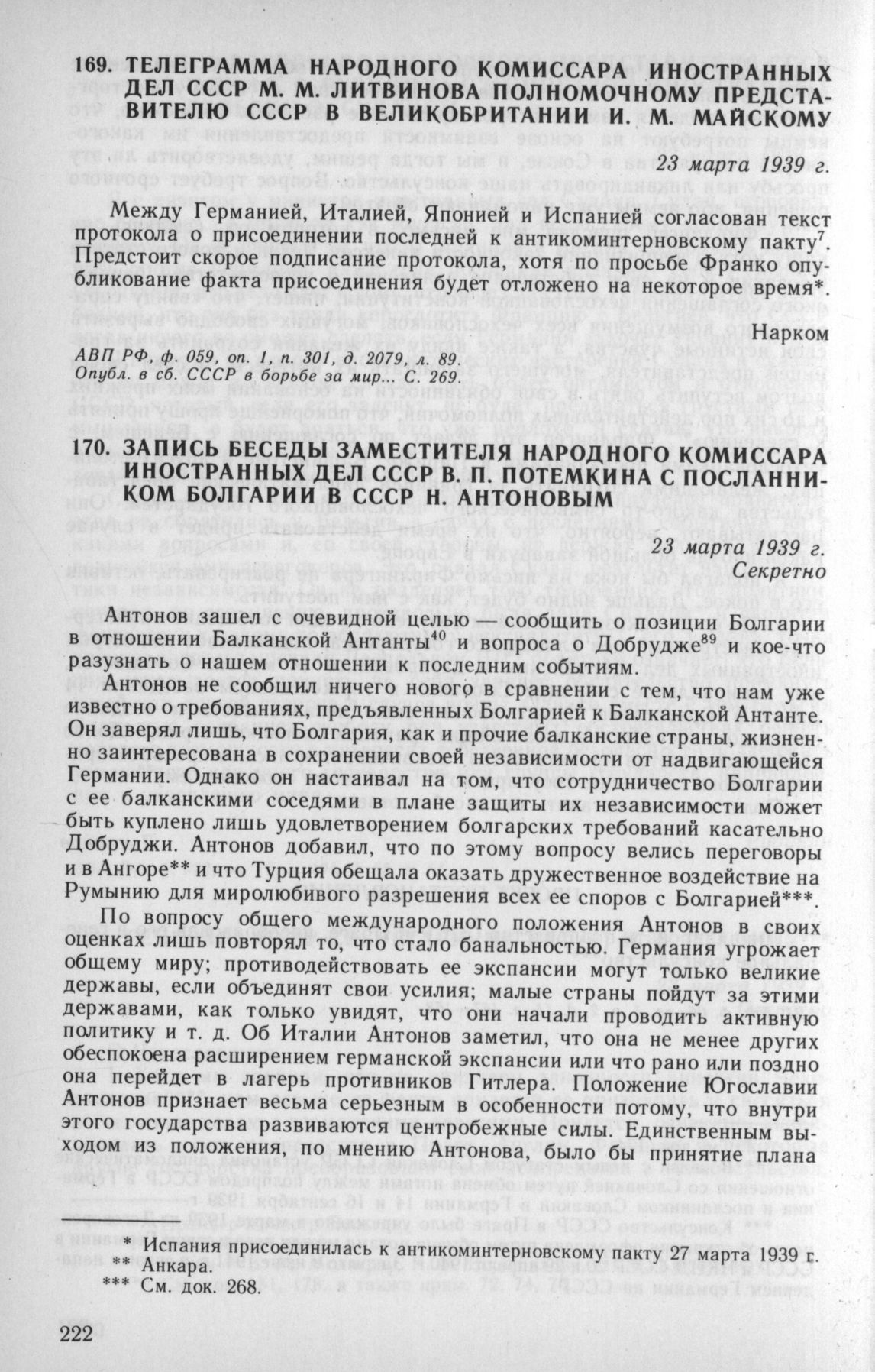 Запись беседы заместителя народного комиссара иностранных дел СССР В. П. Потемкина с посланником Болгарии в СССР Н. Антоновым. 23 марта 1939 г. // АВП РФ, ф. 011, oп. 4, п. 24, д. 6, л. 135—136.