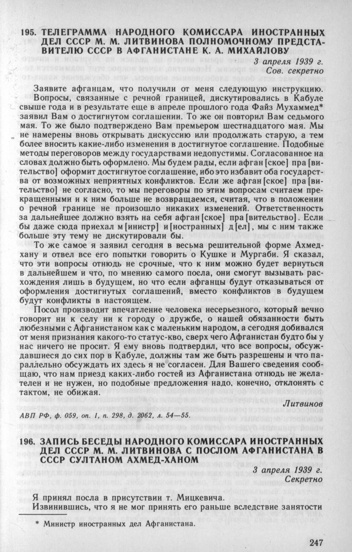 Запись беседы народного комиссара иностранных дел СССР М. М. Литвинова с послом Афганистана в СССР Султаном Ахмед-ханом. 3 апреля 1939 г. // АВП РФ, ф. 06. oп. 1, n. 1, д. 5, л. 190—192.