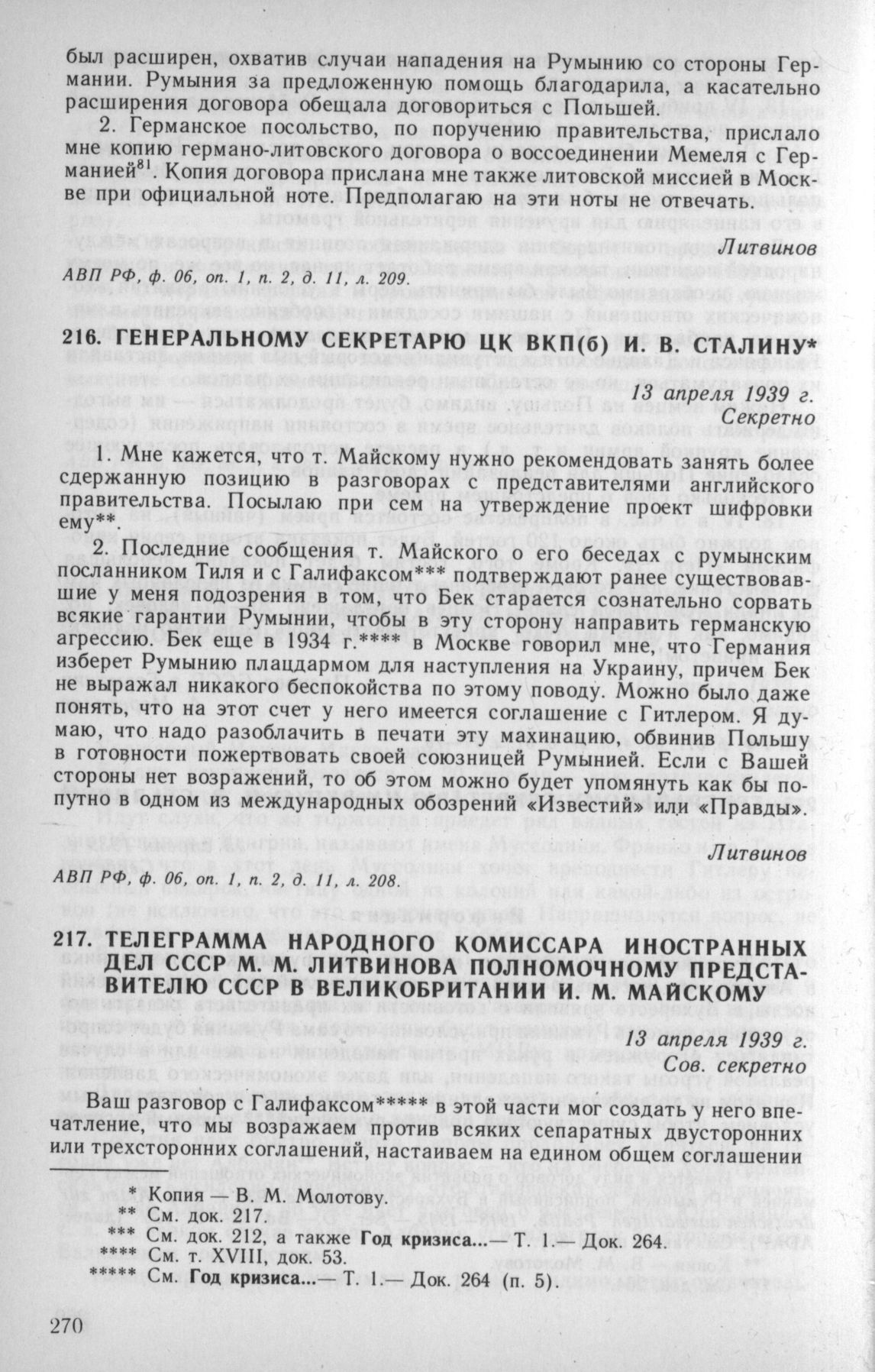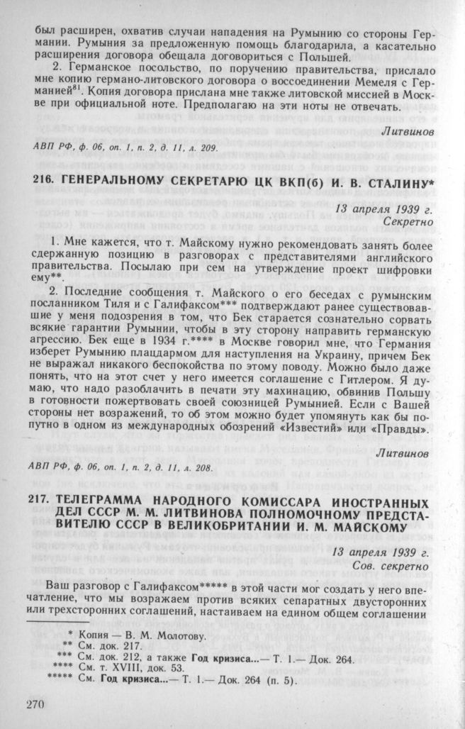 Генеральному секретарю ЦК ВКП(б) И. В. Сталину. 13 апреля 1939 г. // АВП РФ, ф. 06, oп. 1, п. 2, д. 11. л. 208.