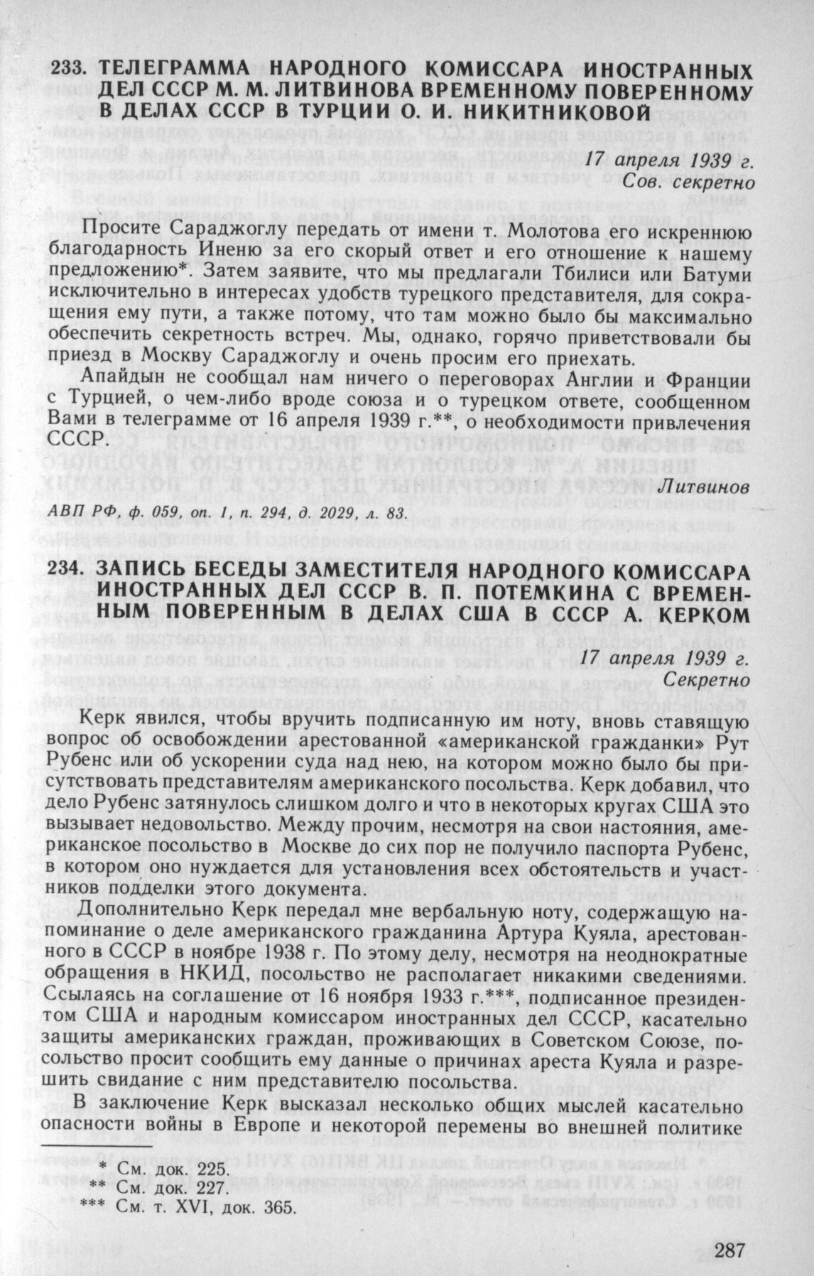 Телеграмма народного комиссара иностранных дел СССР М. М. Литвинова временному поверенному в делах СССР в Турции О. И. Никитниковой. 17 апреля 1939 г. // АВП РФ, ф. 059, oп. 1, п. 294, д. 2029, л. 83.