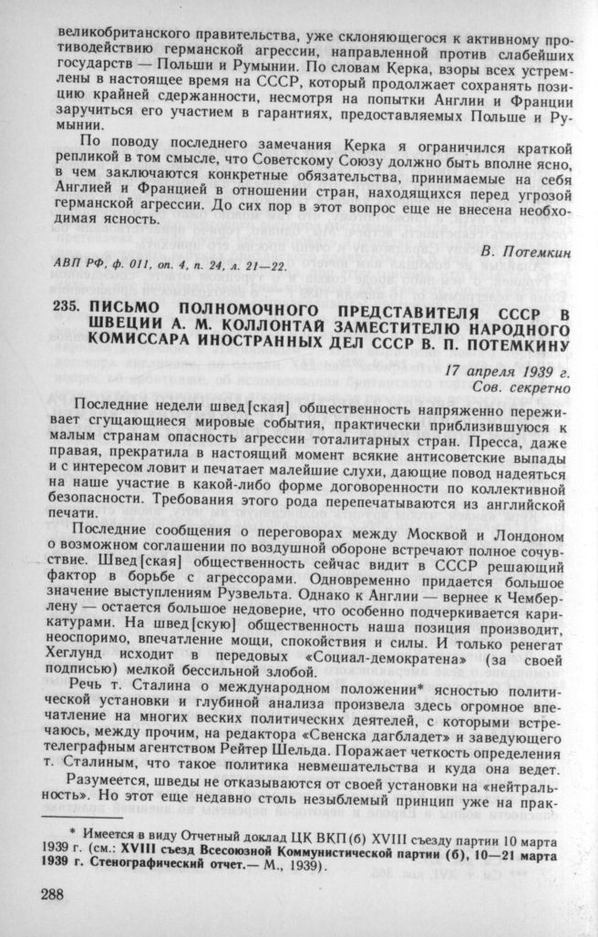 Письмо полномочного представителя СССР в Швеции А. М. Коллонтай заместителю народного комиссара иностранных дел СССР В. П. Потемкину. 17 апреля 1939 г. // АВП РФ, ф. 06, oп. 1, п. 20, д. 222, л. 49—53.